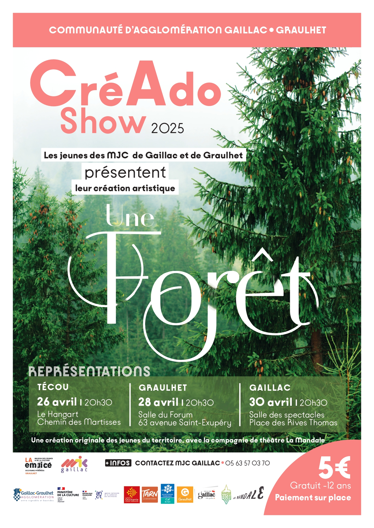 Résidences de création et jeu sur scène. La compagnie professionnelle « LA MANDALE » accompagne des jeunes de 12 à 17 ans dans une aventure humaine et artistique d’ampleur : une création collective immersive dans les arts de la danse, du théâtre, du chant, de la musique qui tourne autour de la question du Choix. Les plus frileux à l’idée de monter sur scène, peuvent également être accompagnés par des professionnels pour participer à la scénographie, à la musique, création de décors, costumes… La création sera présentée au public à la salle multiculturelle de Técou, puis au Forum de Graulhet et à la salle de spectacles de Gaillac les 26, 28, 29 et 30 avril.